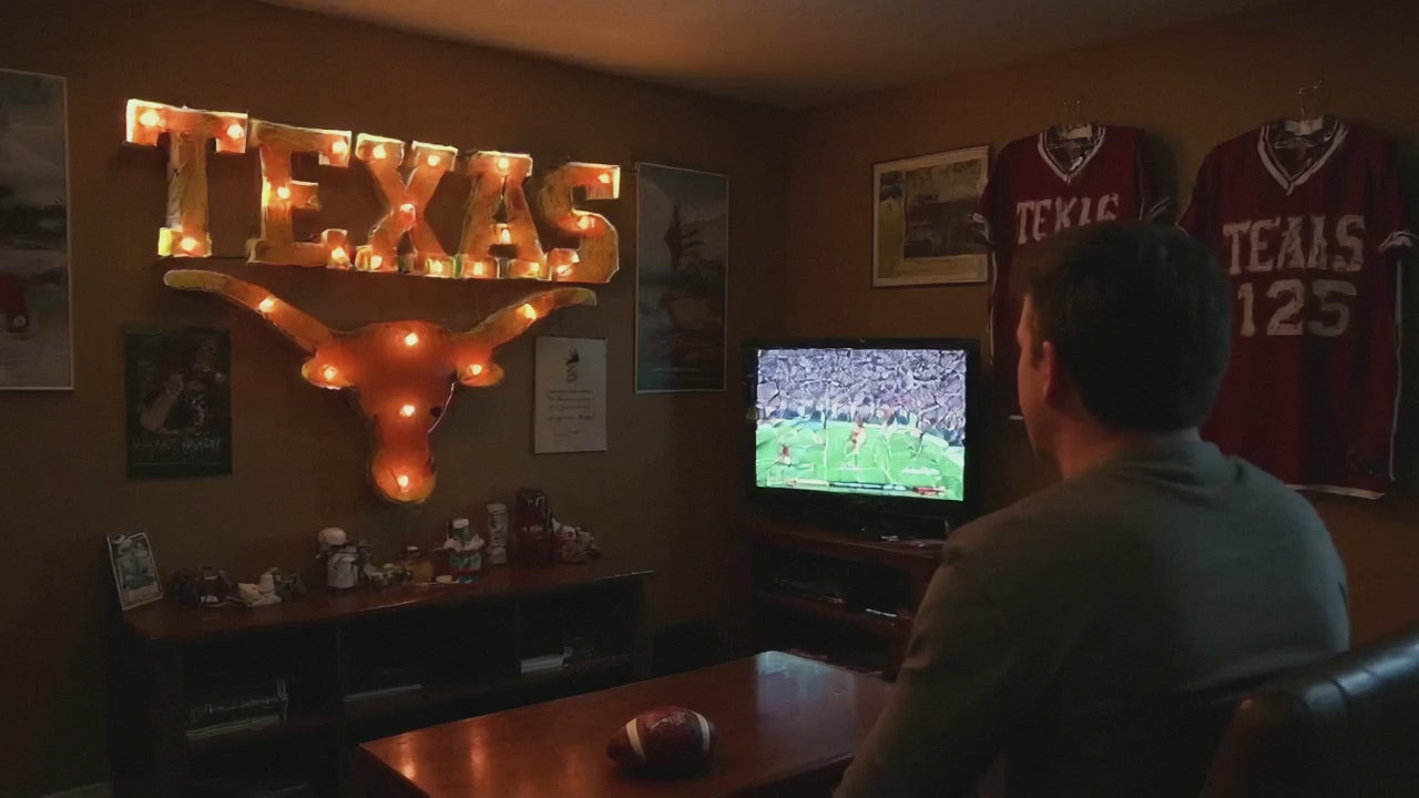 Get ready to light up your space with Longhorn pride! This illuminated, recycled metal decor piece is more than just art—it's a tribute to the legendary spirit of Texas football. Inspired by the grit, passion, and championship legacy of the Texas Longhorns, this eye-catching display captures the energy of game day and the thrill of victory.